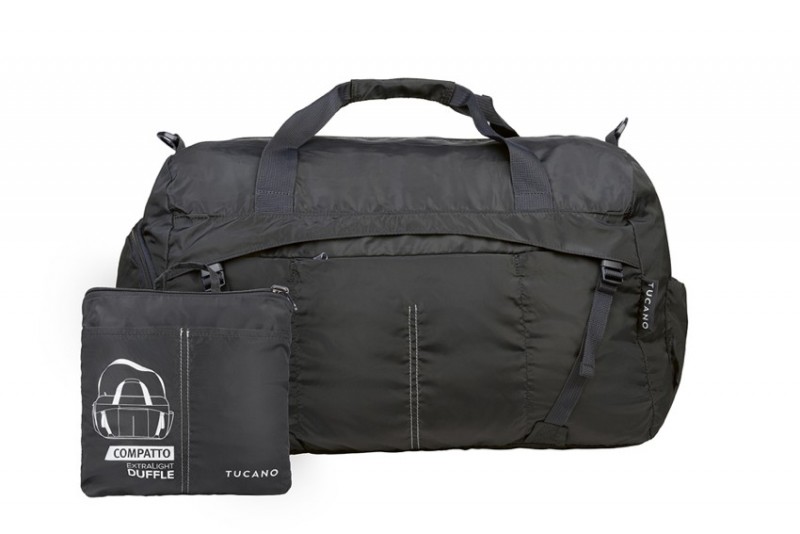 Saco de viagem em tecido de nylon fabricado a partir de plástico reciclado, que dobra e arruma numa pequena bolsa, ideal para levar em viagem para garantir espaço extra de arrumação/transporte em caso de necessidade. Tem capacidade 50 litros, aberto tem
