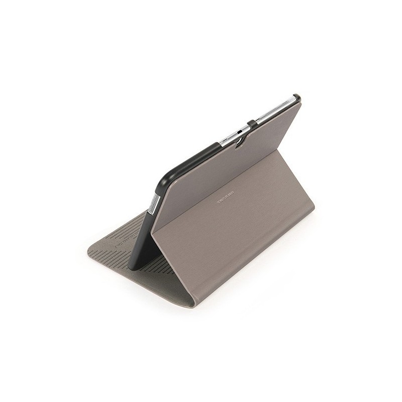 Capa para o Galaxy Tab3 revestida interiomente a microfibra, encaixe rígido para o tablet, e pala frontal em cabedal (PU) com acabamento metálico escovado. Tem magnets built-in que ligam/desligam o tablet, e funcionalidade de stand, com inúmeras posições