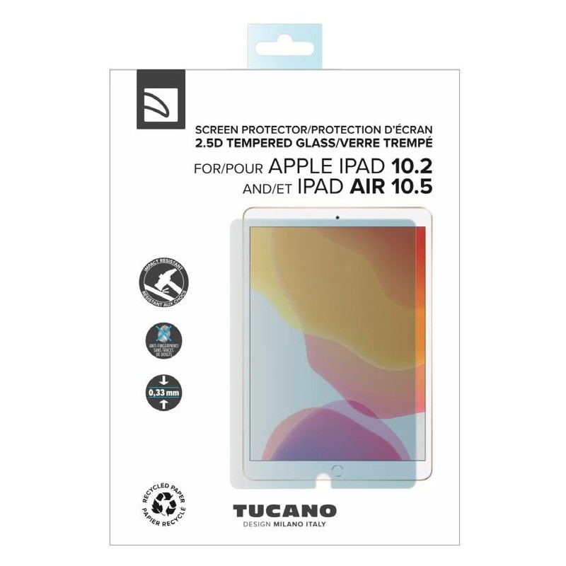 Película de vidro para protecção de ecrã com tratamento anti-dedadas, compatível com iPad 10.2'' (7th e 8th generation) e iPad Air/Pro 10.5'', tem 0.33mm de espessura.