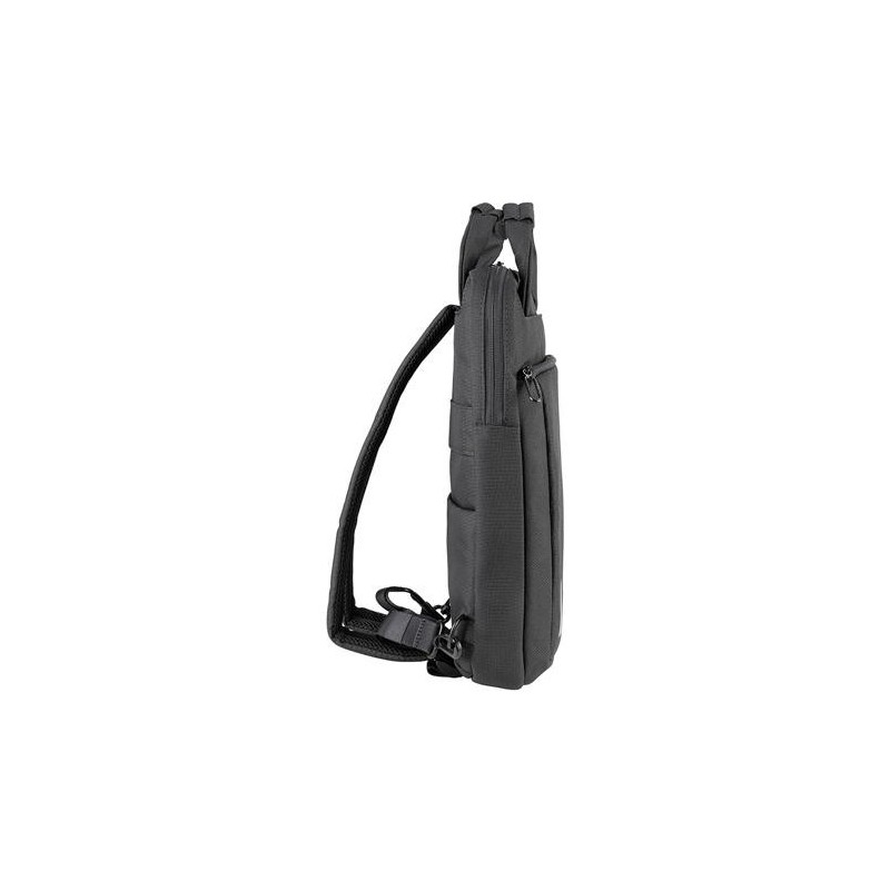 Mochila para portáteis 13/14 com pega, alças, fita trolley, bolso de segurança na traseira, e vários compartimentos interiores e exteriores. O interior é revestido a tecido de cor contrastante. Dimensão máxima do portátil: 31.26 x 22.12 x 1.55 cm.