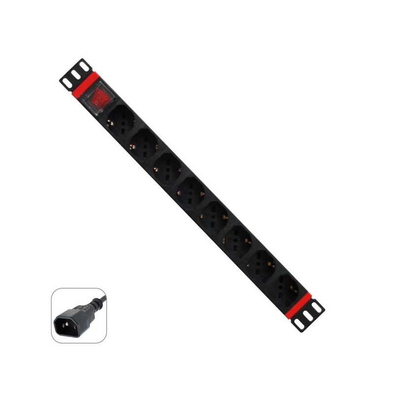 Corpo de alumínio- 8 tomadas tipo / L (10/16 A) híbrido F Schuko- Rack horizontal de 19 (1 unidade)- Interruptor liga / desliga com luz e tampa de segurança- Proteção para crianças- Tensão máxima: 250V / 3500W- Cabo: H05VV-F 3G 1,5 mm2 - 2 mt.- Tipo de p
