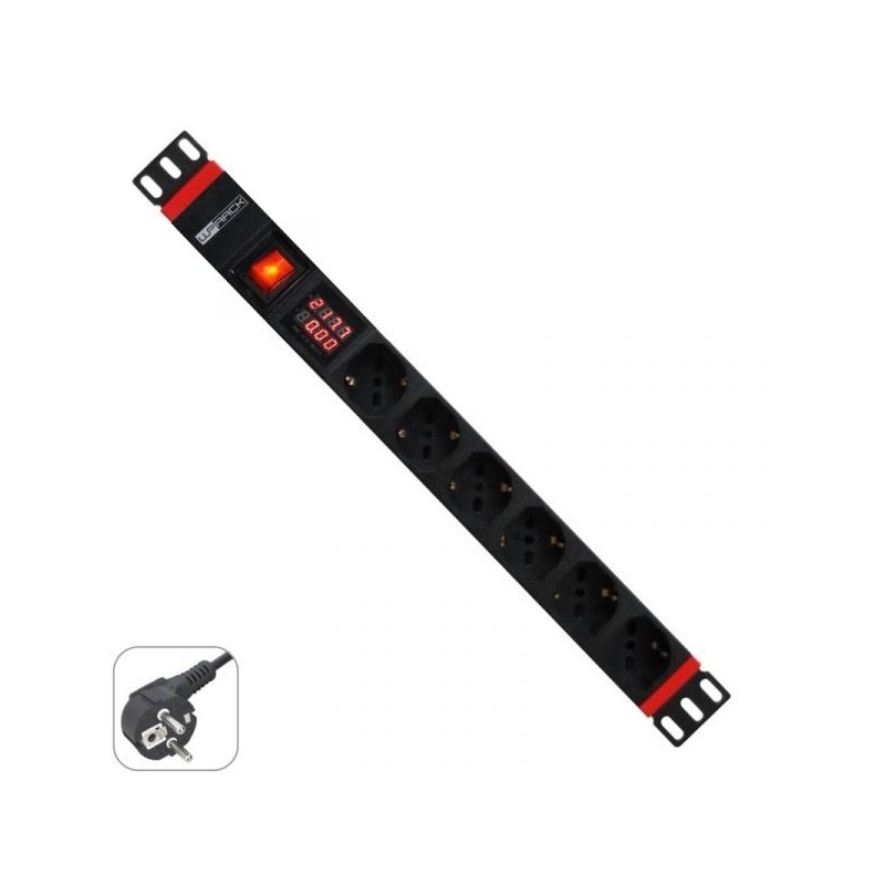 WP WPN-PDU-G02-06. Rack capacity: 1U, Housing material: Aluminium, Product colour: Black, Red. AC outlets quantity: 6 AC outlet(s), AC outlet types: Type F. Cable length: 2 m, Cable type: H05VV-F 3G 1,5 mm2. Output voltage: 250 V, Maximum power: 3500 W